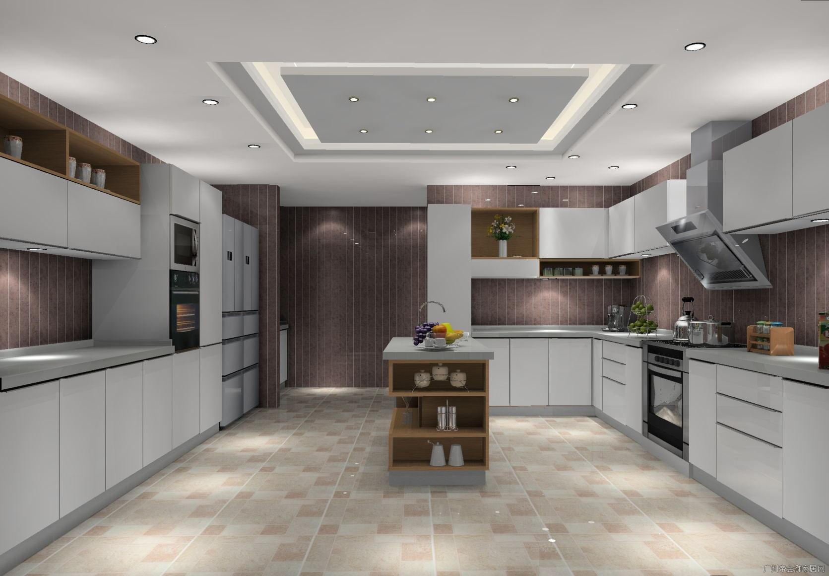 南方空气环境湿润,厨房地板不时会潮湿,厨房踢脚线设为八厘米,不仅可有效防蟑螂老鼠而且防潮性极佳,不会因雾水的渗入使橱柜寿命降低,且柜体采用防潮板可大大提高橱柜寿命。橱柜右边为L型工作台,可在其进行工作烹饪,吊柜门板采用百隆自动感应开关铰链所以没有设计拉手,橱柜中岛下方设计为开放式,可放置水杯等小零件物品,橱柜左边为一字型餐桌加功能柜,可在此进行用餐,一家人坐在一排享受便捷生活带来的快乐与温馨。